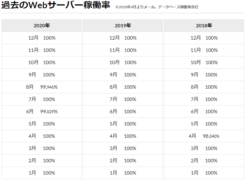 | 稼働率 | 100%保証(SLA) |
